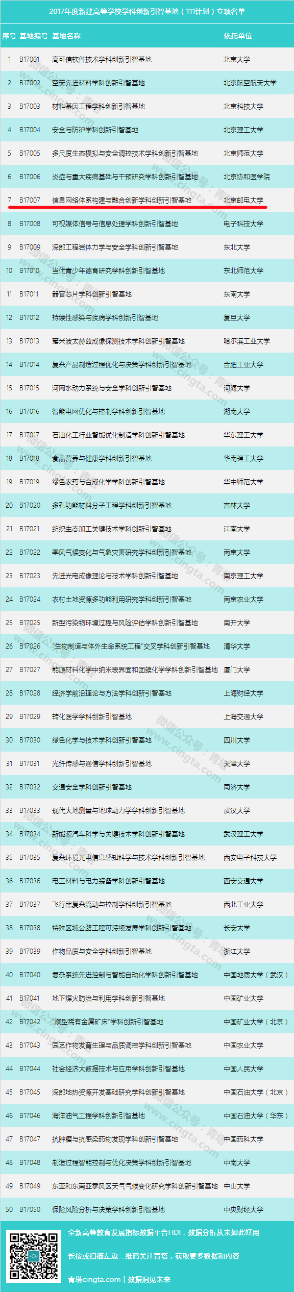 日前,教育部和国家外专局正式公布了2017年新建高等学校学科创新引智计划”(即“111计划”)评审结果,共有50所高等学校学科创新引智基地获得立项。