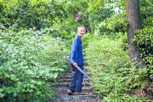 巡防菩山有两条路,一路是蜿蜒起伏的山路,另外一路是水泥地砌平整的大路,庆但叔选择了山路。一路上的路况并不好走,枝丫野蛮生长,占满了道路。老人麻利地拨开树丛,脚步生风,健步如飞,毫不气喘。