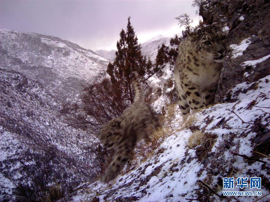 红外相机在11月14日野外拍摄到的雪豹和其幼崽。新华社发