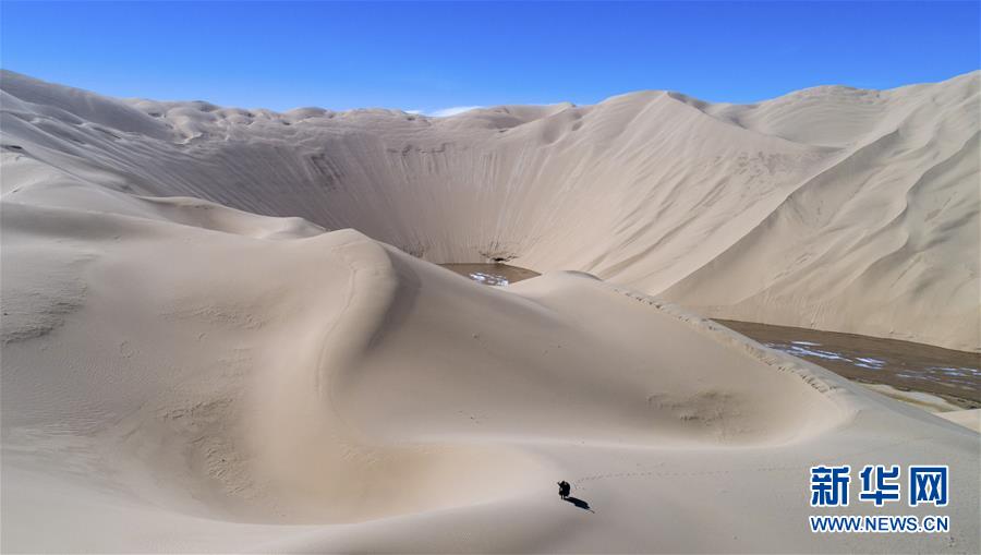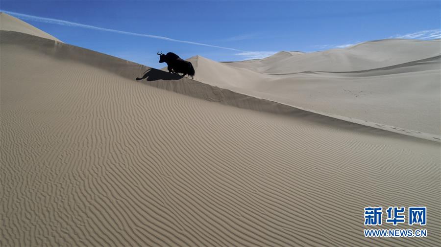 野牦牛翻越阿尔金山国家级自然保护区内海拔4000多米的库木库勒沙漠(4月2日无人机拍摄)。新华社记者 江文耀 摄