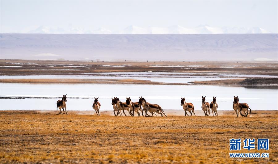 藏野驴在阿尔金山国家级自然保护区内依协克帕提湖畔奔跑(4月1日摄)。新华社记者 江文耀 摄