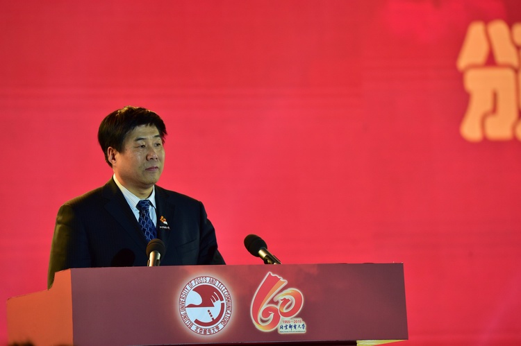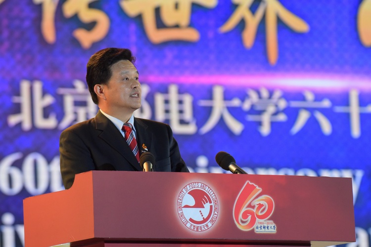 首先,北京邮电大学校长乔建永发表了热情洋溢的演讲。乔校长总结和回顾了北邮走过的六十年征程:用一个个经典和感人实例诠释了六十载沧桑砥砺,一甲子春华秋实。他说,“60本来只是一个普通的数字,因为被赋予了一个甲子的内涵而更加具有意义;邮电只是一个普通的名词,因为承载着国脉所系的事业而更加伟大和光荣。北邮走过的六十年,是北邮人投身于国脉所系的事业,生生不息向前发展的六十年;是北邮人担负起传邮万里责任,与时俱进的六十年;是北邮人崇尚奉献、追求卓越的六十年;是北邮人厚德博学、敬业乐群的六十年;是北邮人求真务实、服务社会的六十年;是北邮人大德大爱、情暖天下的六十年。”乔校长代表北邮庄严宣言:“过去的六十年,国脉所系的神圣使命凝聚着北邮人的智慧与奉献,未来的一甲子,传邮万里的光荣职责将激发起北邮人新的期待和新的梦想。光荣属于国脉所系的伟大事业!光荣属于弦歌不辍的北京邮电大学!光荣属于传邮万里的北邮人!”