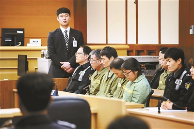 当地时间11月11日,韩国光州,沉没渡轮“岁月号”船长李俊锡和船员们在法庭听审 图片/CFP