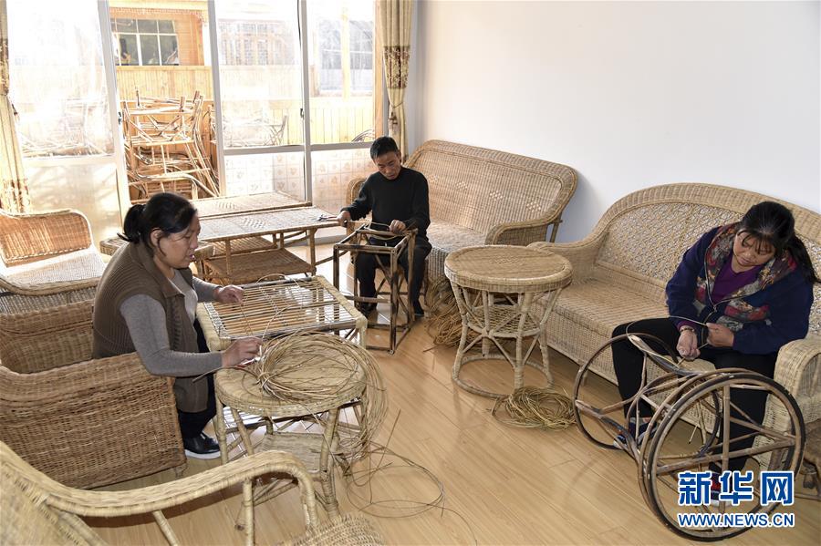 11月8日,在贵州省遵义市汇川区板桥镇,村民吴世未在家里用竹条编织茶几。 新华社发(罗星汉 摄)
