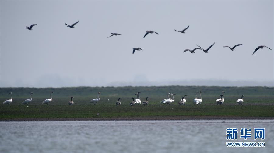 一群小天鹅和豆雁在东洞庭湖国家级自然保护区内聚集(2月26日摄)。 新华社记者 李尕 摄