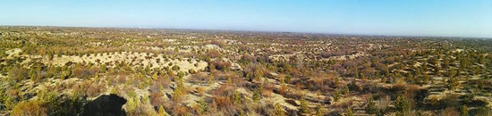 顺着他的指引,记者放眼望去,所有的沙丘上都有植被覆盖,沙柳、花棒、踏榔、旱柳、杨树等植物将这里的沙丘牢牢地稳定住。在初冬时节满眼的苍灰色中,这片林地中跳跃的很多绿色分外明显。郭成旺的孙子郭建军说,这些都是他们家从2011年开始栽种的樟子松。