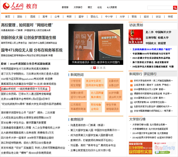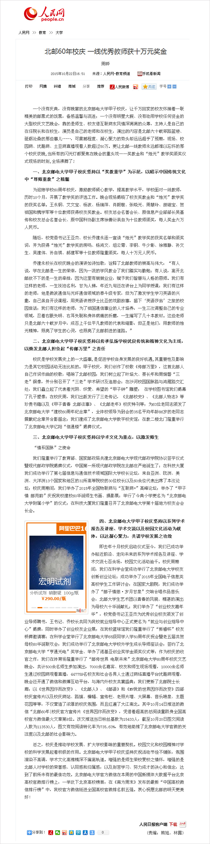 人民网首页刊发“北京邮电大学甲子校庆文化与学术氛围浓厚 一线优秀教师获十万元奖金”