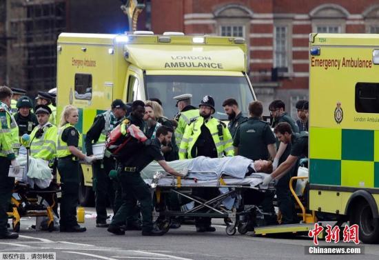 当地时间3月22日下午,英国议会大厦外发生一起袭击事件。图为伤者被送往医院。