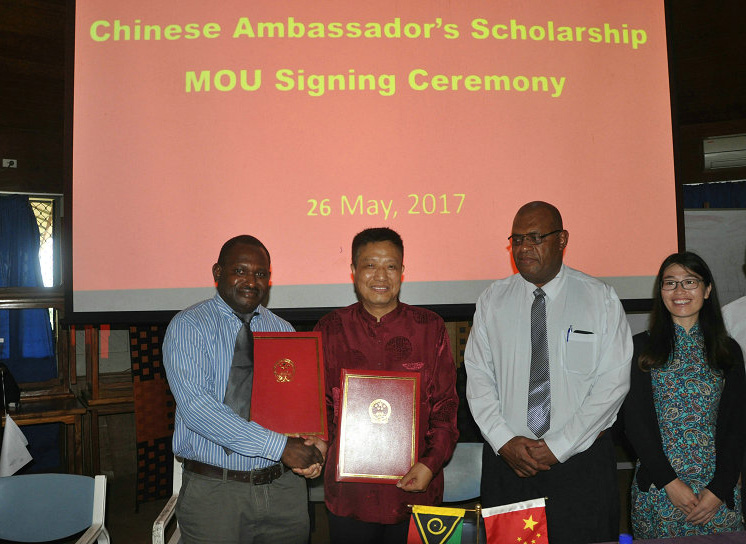 伴随“一带一路”高端会谈的春风,瓦努阿图“中国大使奖学金”于5月26日正式落地南太平洋大学艾玛卢校区。此奖学金专门用于支持瓦努阿图渴望攻读南太平洋大学孔子学院下设瓦努阿图孔子课堂汉语学分课的贫困学生。
