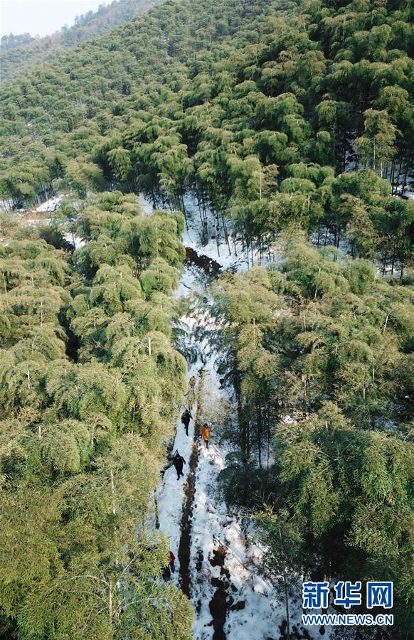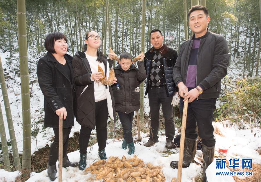 2月8日,村民带着游客在安吉县横溪坞村竹林里体验挖冬笋。 新华社记者翁忻旸摄