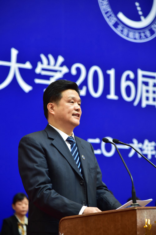 今天,我们在这里隆重举行2016届研究生毕业典礼,共同见证同学们顺利完成学业,即将开启人生的崭新征程。借此机会,我代表学校,向顺利完成学业获得学位的同学们表示热烈的祝贺;向悉心指导、辛勤培育你们的导师,以及为你们成长服务的全校教职员工表示衷心的感谢;向为你们的进步无私付出的家长及亲友们致以诚挚的敬意!(掌声)