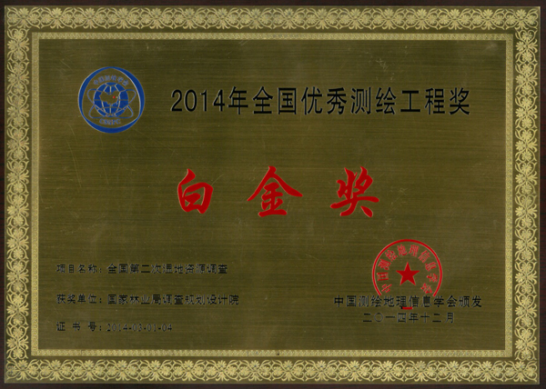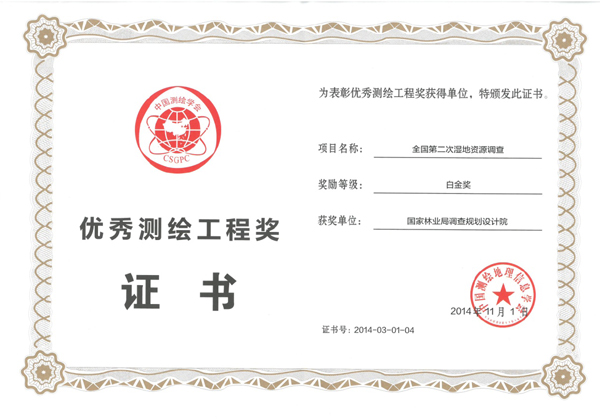 全国优秀测绘工程奖是经国家测绘地理信息局、科学技术部批准,由中国测绘地理信息学会设立,是中国测绘地理信息行业最高级别的工程奖项。近年来,由规划院主持完成的第四次全国荒漠化和沙化监测获2012年优秀测绘工程奖金奖,全国高分辨遥感数据处理、区划及林地“一张图”数据库建设获2013年优秀测绘工程奖白金奖。一系列奖项的获得,充分显示了规划院的技术实力和业务水平,进一步提升了规划院资源调查监测和测绘工程领域的形象,扩大了社会影响。