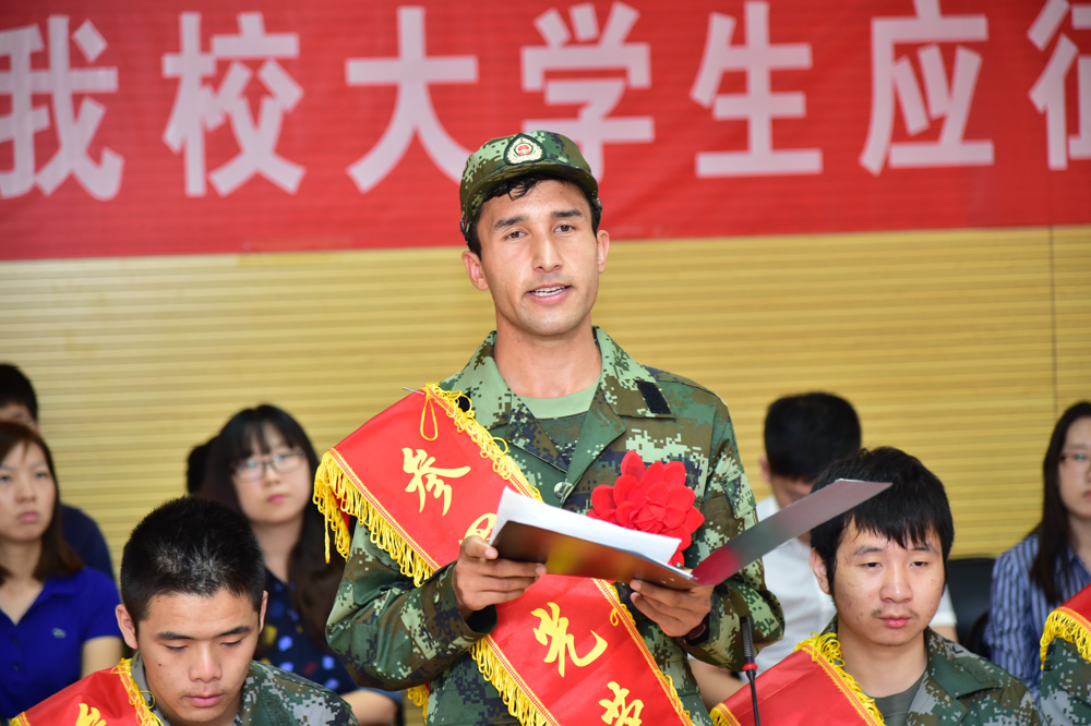 公共管理学院的麦合木提﹒麦麦提同学代表入伍新兵发言。他表达了对国家政策和学校关怀的感谢,并承诺作为一名90后北邮人,定会责无旁贷、义无反顾的担当起历史重任,不负学校和老师的希望和嘱托。