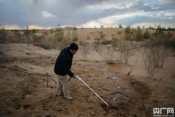 亿利集团员工正在用新技术种植树苗(央广网记者 郁雨铖 摄)