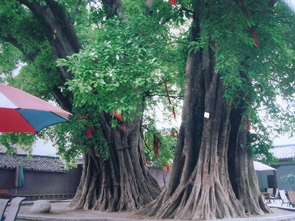 1997年,川西坝遇上百年不遇的大雪,大雪纷纷扬扬从天而降,一夜间川西坝银妆素裹。昔日的绿色变成威风的银甲武士,屹立桥畔。百姓眼里,大雪让古树有另一种风景,干部眼里,看到的不是银光素裹而是百姓的安全。古树下有村卫生站和老年协会茶馆,毎天听川戏围鼓的老人络绎不绝。古树年龄太老,万一豁喇喇地压下来,岂不酿成悲剧?村干部上报乡政府,乡政府给古树做“除枝剔桠”手术。古树瘦身后,变得苍老了。春天到了,苍翠的绿叶少了,“树庇五亩阴”的景象也一年不如一年。仙桥村人想,生态文明承载不能断,两千多年的古树决不能毁在我们手中。村里将卫生站和老协搬迁出去,选择谢善刚孟正木为古树新呵护人。谢善刚孟正木以古树为名办了家八景农家乐,德阳八景篇篇都讲人文历史与生态文明,生意红火。保护古树要钱,他们把赚来的钱用于古树,砌了保护石栏,天天浇水。两年下来,古树绽露新叶,新叶在清风中摇曳。