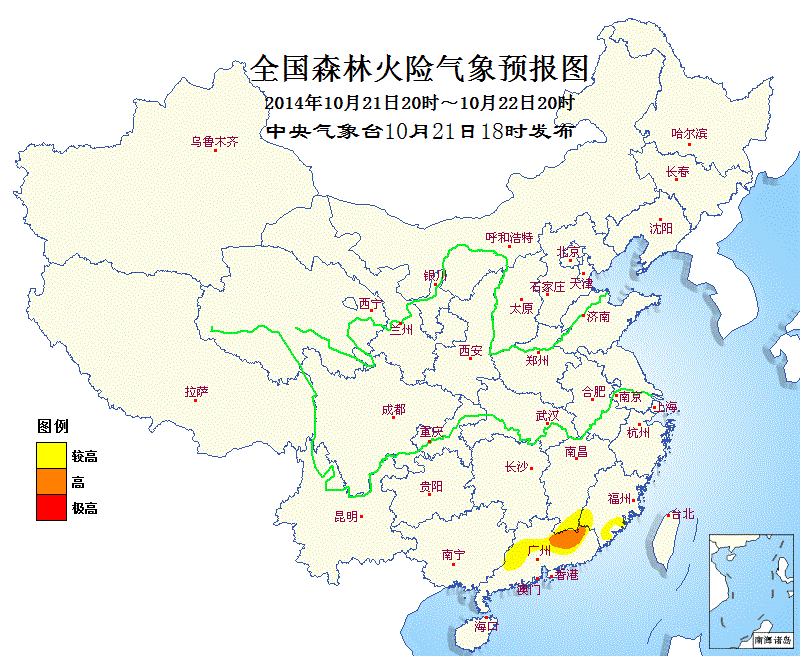 据中央气象台10月21日下午预报,今天晚上到明天,广东东北部的局部地区森林火险气象等级为高度危险(四级)。