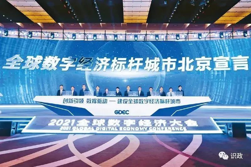 近年来,北京立足自身资源禀赋,坚持国际一流、首善标准,积极打造中国数字经济发展“北京样板”。2021年8月2日,以“创新引领 数据驱动——建设全球数字经济标杆城市”为主题的首届全球数字经济大会在北京国家会议中心开幕。图为《全球数字经济标杆城市北京宣言》发布现场。 侯少卿/摄