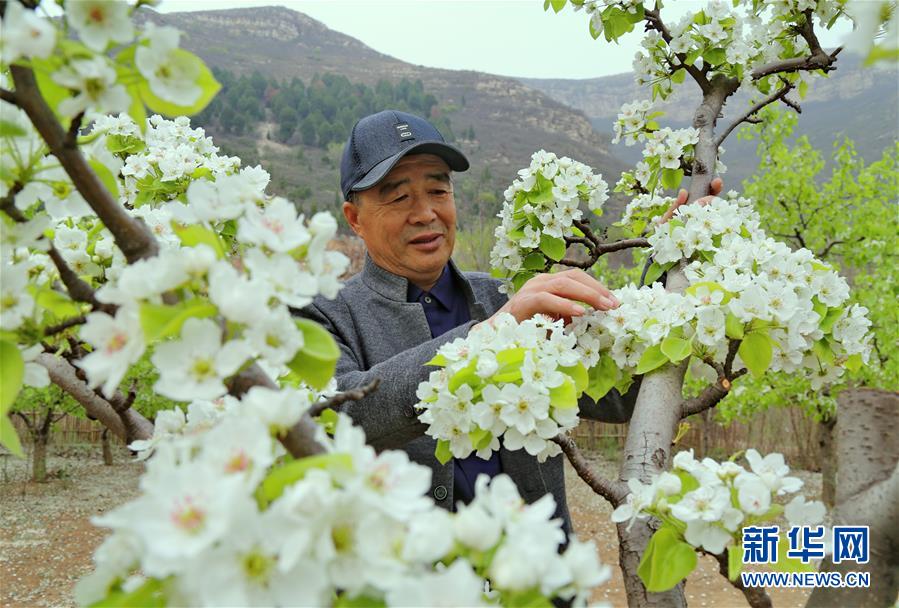 4月14日,陈宝龙在生态园内给梨树疏花。