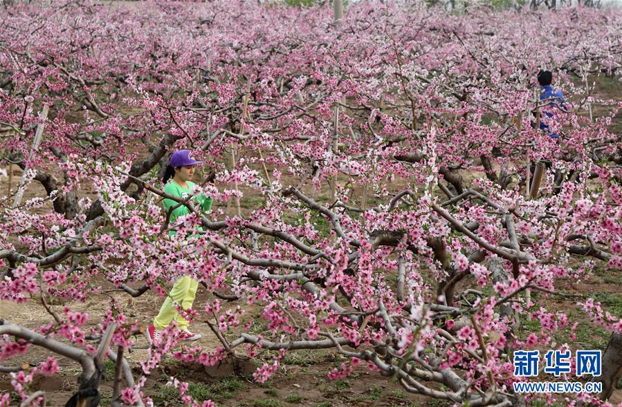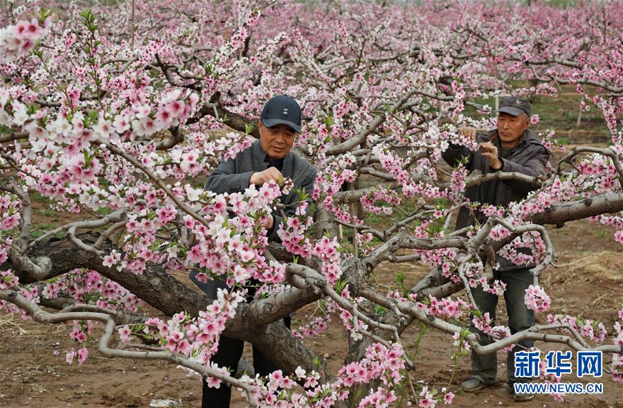4月14日,陈宝龙(左)和工人一起在生态园内管理桃树。