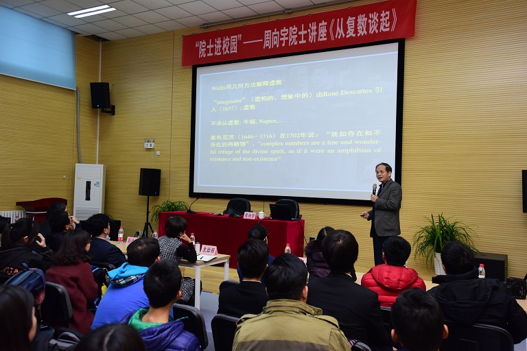乔建永校长对周向宇院士的到来表示热烈欢迎,介绍了周向宇院士的基本情况和学术成就。周院士从复数产生的历史谈起,叙述了复数基本性质、复分析基本内容及其与其它数学领域的联系,介绍了中国数学家在多复变领域的以往成就与新近进展。周院士用棣莫弗定理和瑞士数学家欧拉提出的欧拉公式以及高斯、库默尔对复数的应用等知识,说明了复数的重要性;用k平方和引出复变函数的研究,并结合自己的求学、研究经验展开详细的介绍。随后,周院士向大家展示了数学界新近成果和研究进展,引用了庄子的“人皆知有用之用,而莫知无用之用”来鼓励同学们要有长远的眼光,学会提升自己。随后的提问环节,现场气氛热烈,大家踊跃发言,周院士热情与同学们交流互动,耐心答疑解惑。