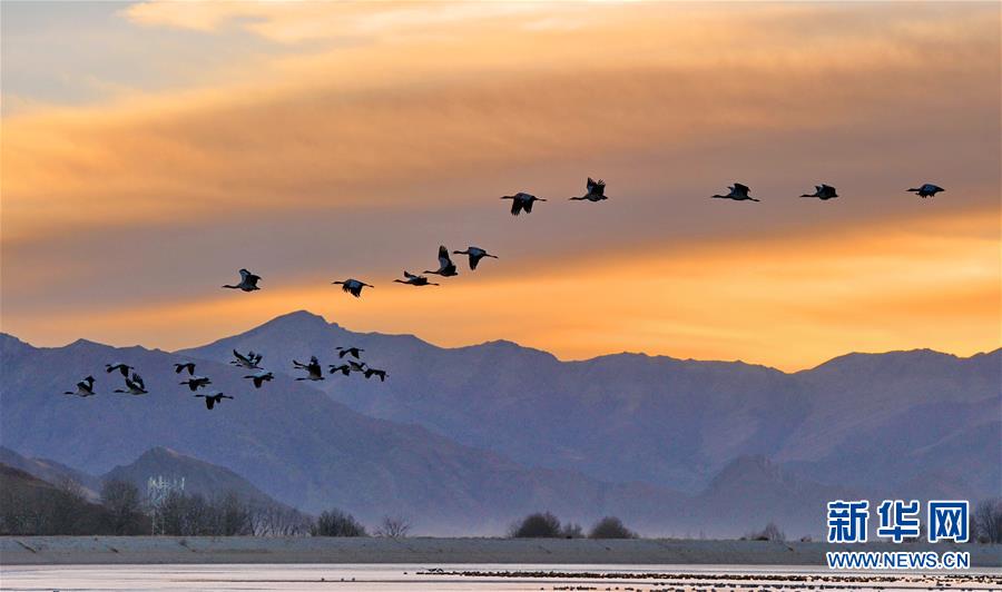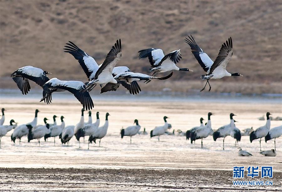 黑颈鹤在拉萨市林周县自然保护区上空盘旋(1月1日摄)。 新华社记者 张汝锋 摄
