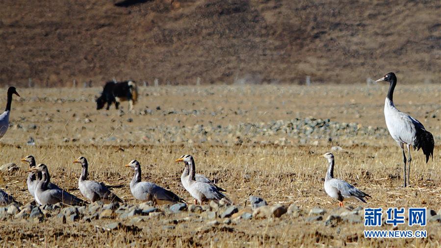 这是1月1日在拉萨市林周县拍摄的黑颈鹤和斑头雁。 新华社发(李军 摄)
