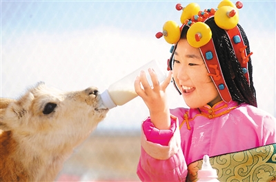 藏族小姑娘为受伤的小藏羚羊喂奶。 侯德强摄