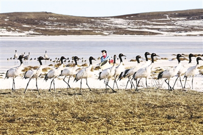 志愿者为大山包湿地越冬黑颈鹤投食。 道美标摄(资料图片)