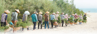图为陶凤交带领绿色娘子军去海边植树。 廖传松摄